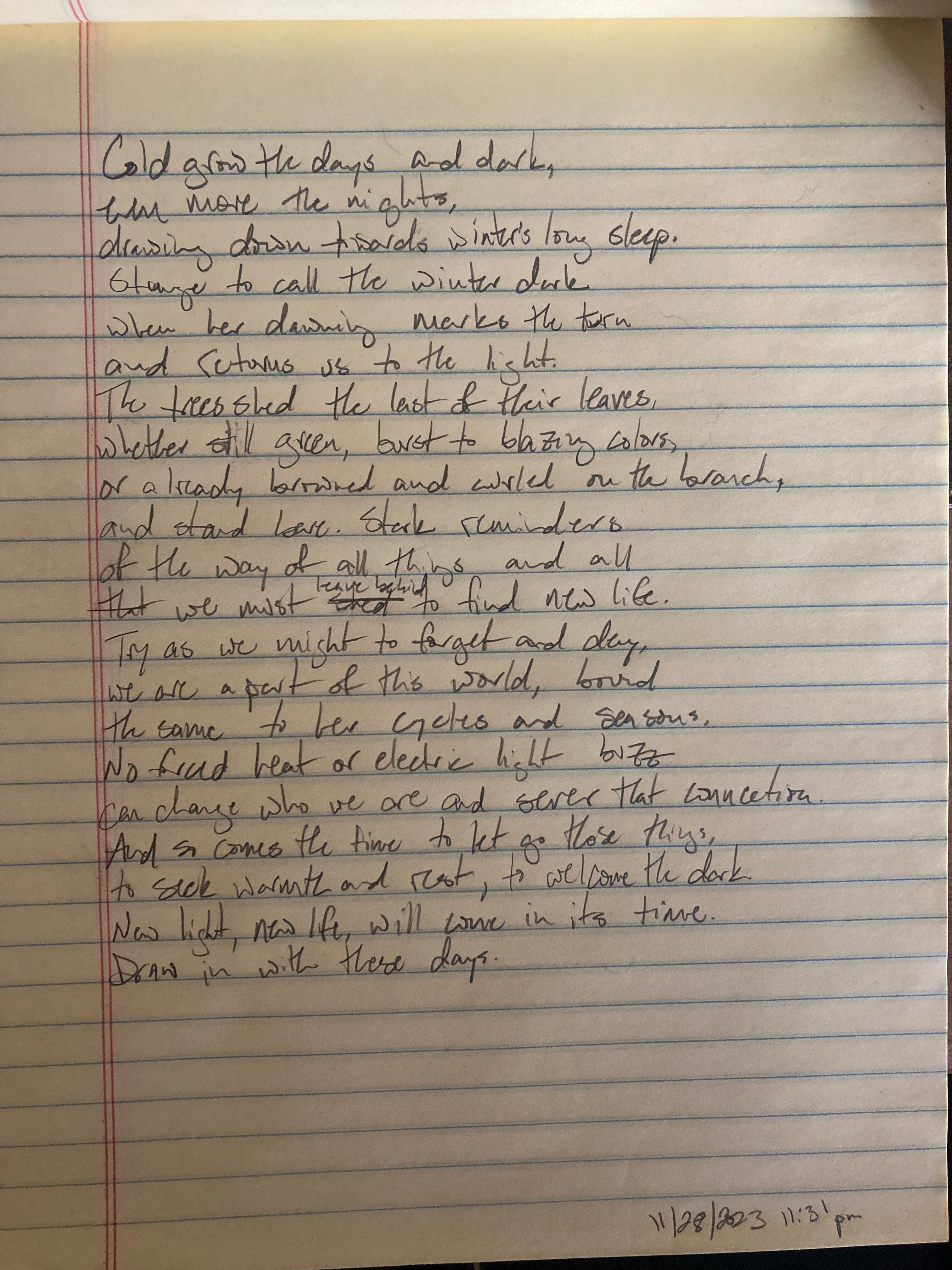Cold grow the days and dark. Even more the nights, drawing down toward winter’s long sleep. Strange to call the winter dark when her dawning marks the turn and returns us to the light. The trees shed the last of their leaves whether still green, burst to blazing colors, or browned and curled still on the branch, and stand bare. Stark reminders of the way of all things and all we must leave behind to find new life. Try as we might to forget and deny, we are part of this world, bound the same to her cycles and seasons. No forced heat or electric light buzz can change who we are or sever that connection. And so comes the time to let go what we must, to seek warmth and rest, to welcome the dark. New light, new life, will come in its time. Draw in with these days.